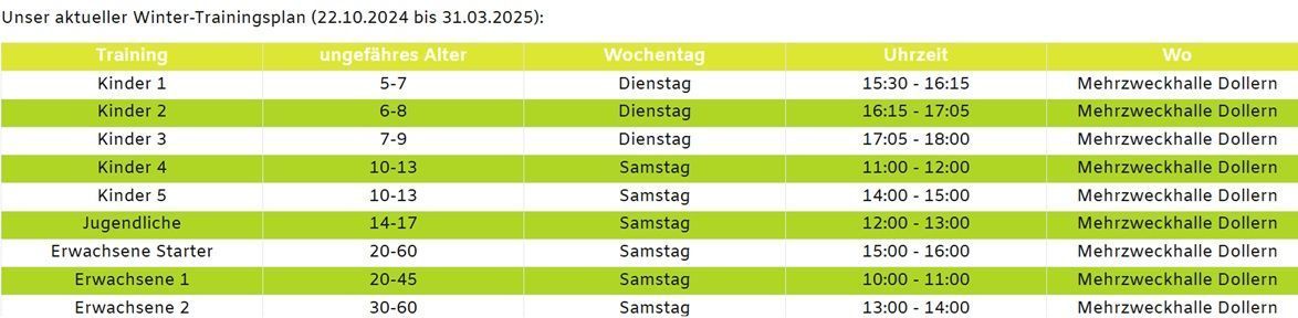 Das Wintertraining ist am 22.10.2024 gestartet. Es wird mittlerweile in allen Altersklassen durch Marc Dankbar und Jan Petermann trainiert. Das Training findet Dienstags für Kinder zwischen 6-9 Jahre und Samstags für Kinder, Jugend und Erwachsene ab 10 Jahre statt. Abo-Preise sind nach Alter gestaffelt: 06-09 Jahre 49€ ca. 18 Termine 10-17 Jahre 65€ ca. 15 Termine 18-99 Jahre 79€ ca. 15 Termine Wir sind schon sehr stark ausgebucht. Anfragen lohnt sich immer: info@tc-dollern.de